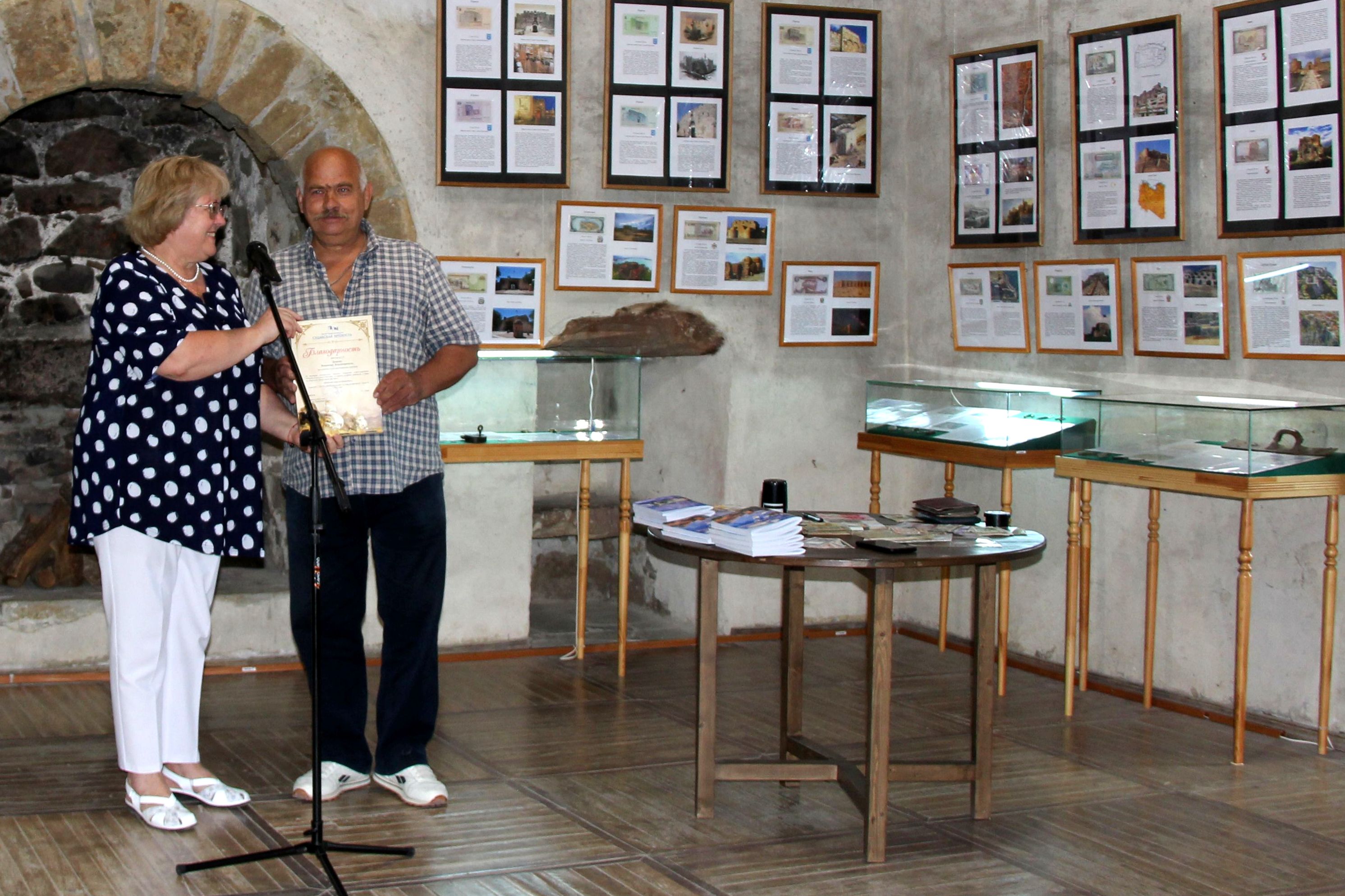 Открыла выставку директор музея-заповедника «Судакская крепость» Светлана Емец. Она поздравила присутствующих с открытием новой выставки и подчеркнула, что это не первый совместный проект с Феодосийским клубом коллекционеров. Ранее уже были представлены в музее выставки членов клуба Владимира Дьякова «Деньги гражданской войны», «Деньги СССР» и Бориса Яремко «Образ пленительный, образ прекрасный». Плодотворные крепкие связи музея-заповедника и феодосийских коллекционеров подчинены одной большой цели – миссии просвещения. Светлана Григорьевна вручила благодарность Владимиру Дьякову за личный вклад в организацию выставки.