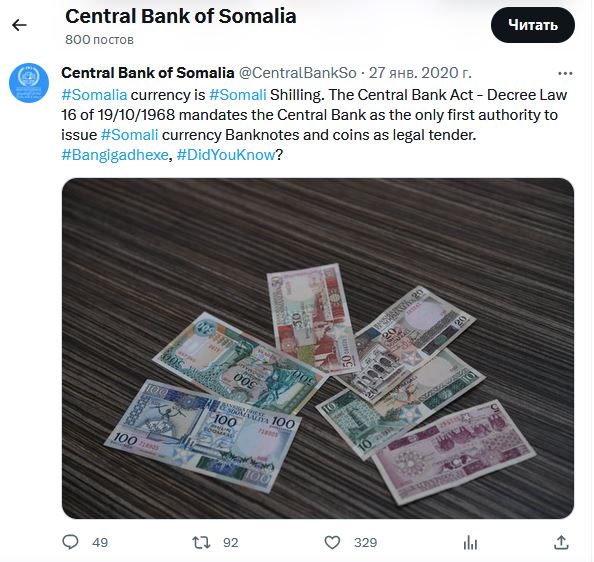 Кстати, кто-нибудь знает, как там в Сомали актуальная ситуация в плане денег? Пытался найти что-нибудь официальное - какая-то мешанина выходит... Официальный центробанк Сомали в соцсетях пару лет назад форсил изображения "старых" шиллингов образца 1983-1990 годов с контекстом "вот это вот правильные шиллинги". И декларирует курс USD 1.759 за 1000 шиллингов (судя по всему, тех самых, "правильных"). Понятно, что никто в реальной ситуации не будет проводить такой обмен, так как каждый, кто объявлял себя властью в Сомали стремился навыпускать этих тысячных бумажек в максимальном количестве...