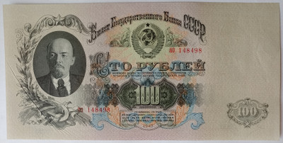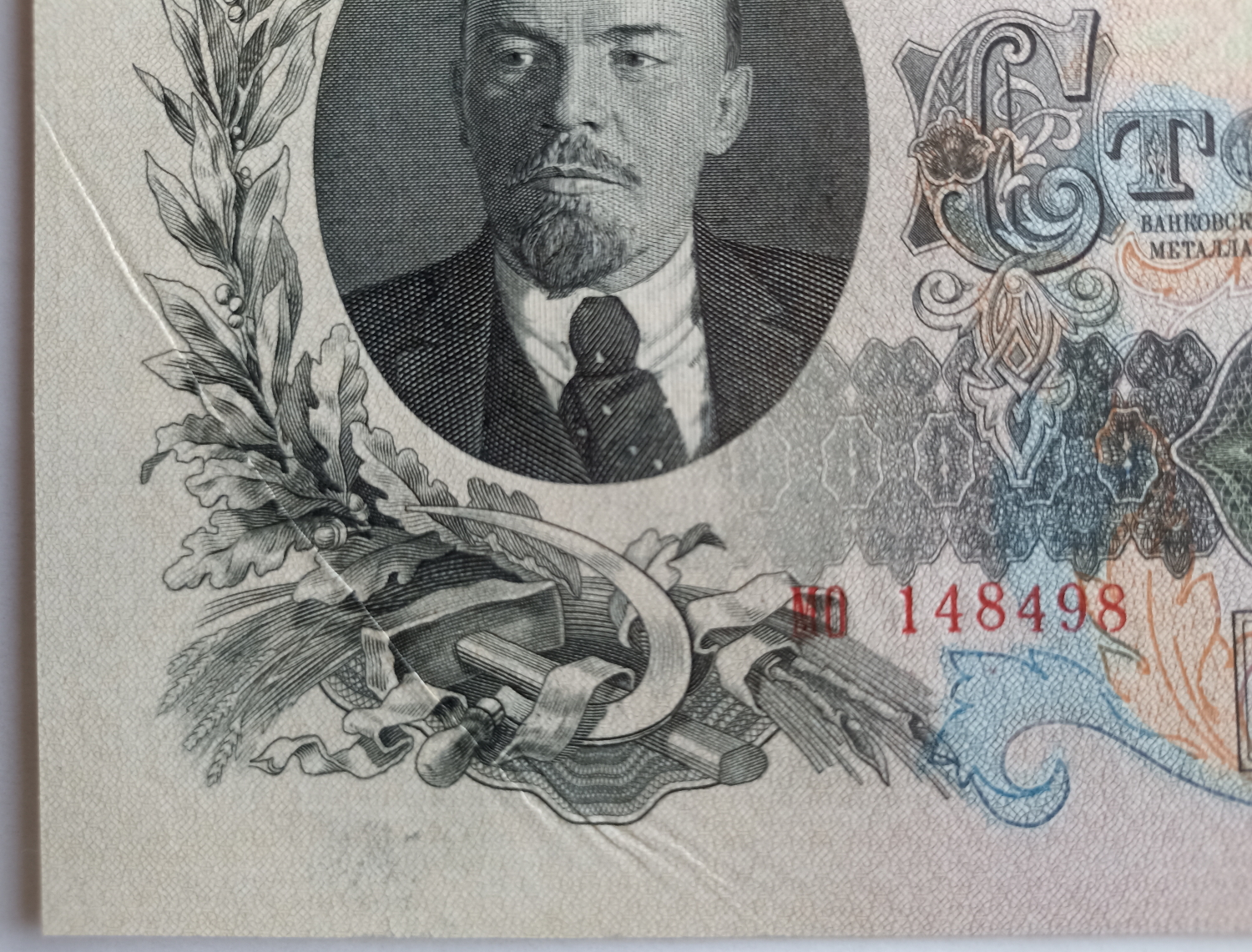 Описание лота: Билет Государственного Банка СССР номиналом 100 рублей образца 1947 года (16 лент). Серия: МО. С существенным смещением печати на оборотной стороне вниз и браком предпечатной подготовки: массивной косой складкой в левом нижнем углу, образовавшейся при подачи влажной бумаги в валы печатной машины. АНЦ.