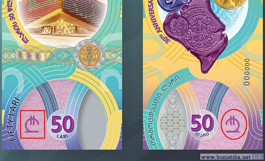 Возможно, символ лари изображён на прозрачном окне и тогда на противоположной стороне банкноты будет - зеркальное изображение.