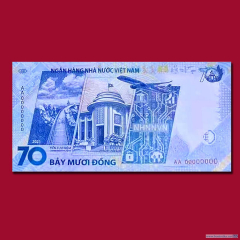 Государственный банк Вьетнама (Ngân hàng Nhà nước Việt Nam, State Bank of Vietnam) сообщил о выпуске сувенирной банкноты номиналом 70 донгов. Необычный номинал связан с юбилеем национальной денежной систему Вьетнама, 70-летие которой празднуется в нынешнем году.