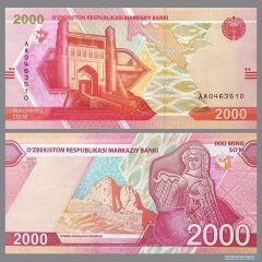 Темой оформления новых банкнот стало историческое наследие Узбекистана, на купюрах изображены памятники истории и культуры страны. Банкноты датированы 2021 годом.