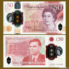 Купюра номиналом 50 фунтов стерлингов стала завершающей в серии банкнот нового поколения на полимерной основе. Она посвящена памяти английского математика Алана Тьюринга (Alan Mathison Turing, 1912-1954 гг.), портрет которого изображен на обороте денежного знака.