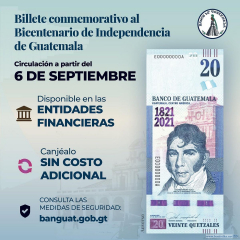 Банк Гватемалы (Banco de Guatemala) официально сообщил о том, что выпуск памятных банкнот, посвященных 200-й годовщине провозглашения Декларации независимости Центральной Америки , начнется с 6 сентября 2021 года.