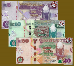 Банк Замбии (Bank of Zambia) выпустил в обращение новые тиражи денежных знаков номиналом 5, 10 и 20 квача образца 2018 года.