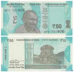 Резервный банк Индии (Reserve Bank of India, RВI, भारतीय रिज़र्व बैंक) выпустил в наличное денежное обращение новый тираж денежных знаков номиналом 50 индийских рупий образца 2017 года.
