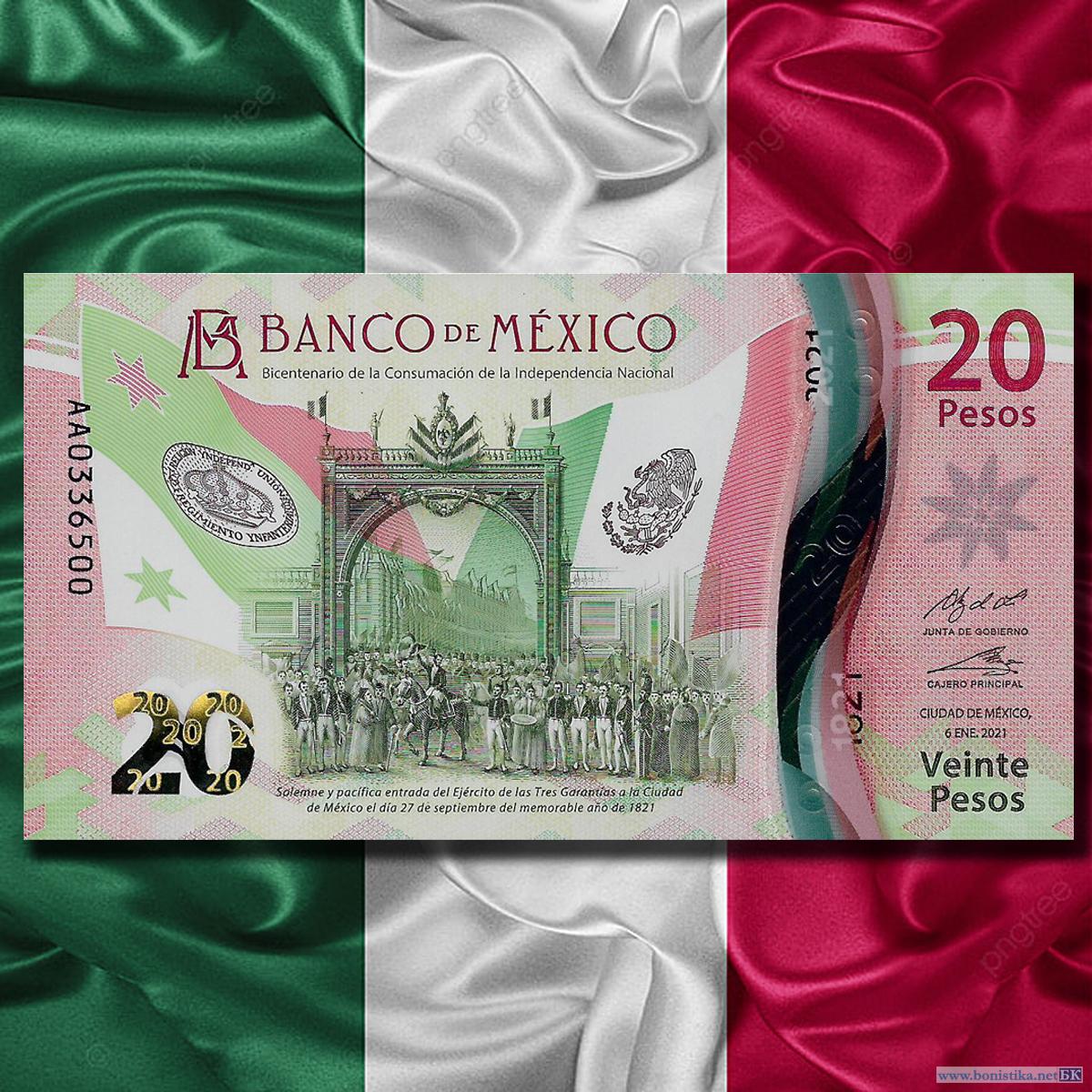 Банк Мексики (Banco de México, ВМ) выпустил тираж памятных банкнот номиналом 20 мексиканских песо образца 2021 года семейства G (familia G), посвященных 200-й годовщине провозглашения независимости от Испанской Империи (Bicentenario de la Independencia Nacional).