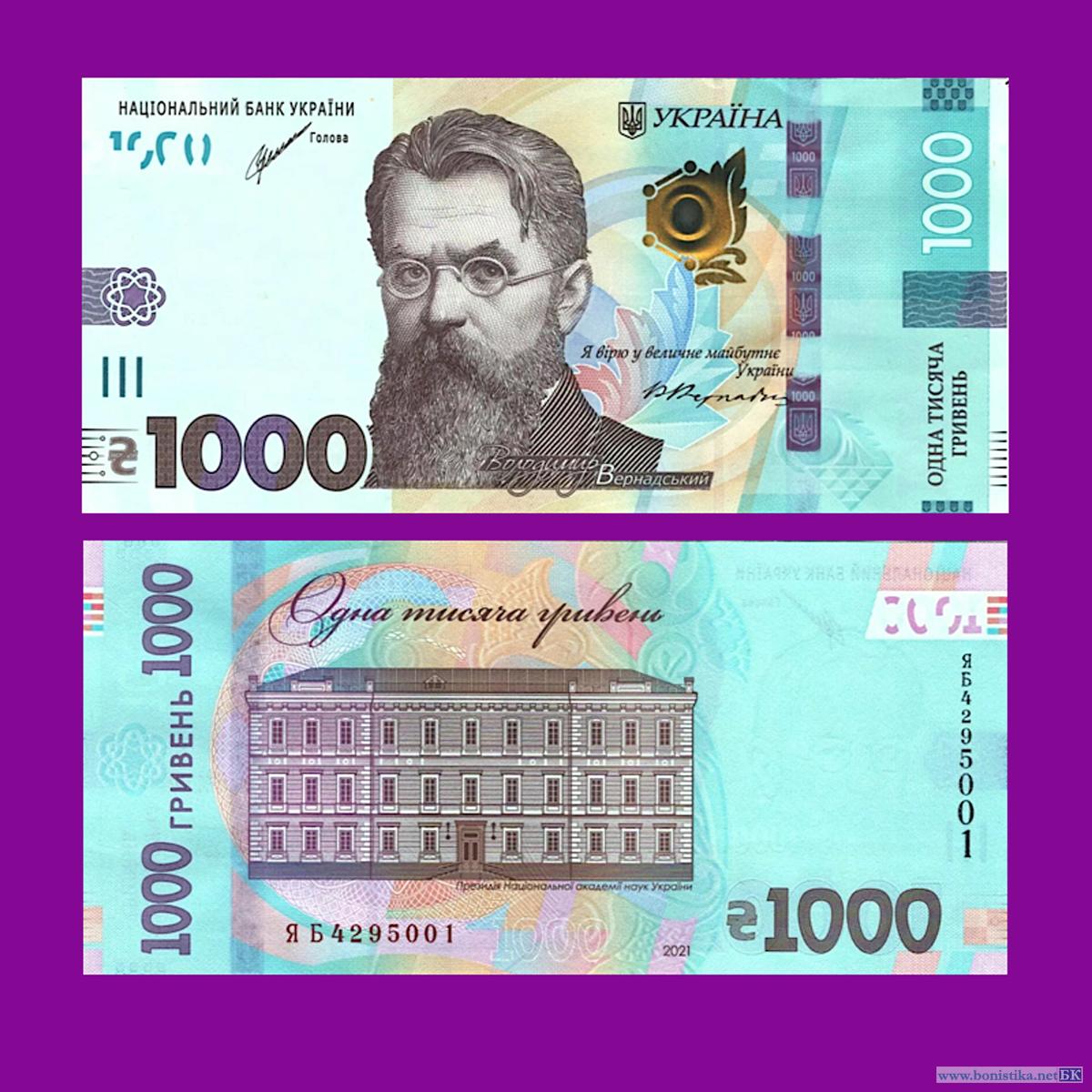Национальный банк Украины (Національний банк України, НБУ) с 7 декабря 2021 года начал эмиссию нового тиража денежных знаков номиналом 1 000 гривен. Информация об этом опубликована а сайте ведомства bank.gov.ua