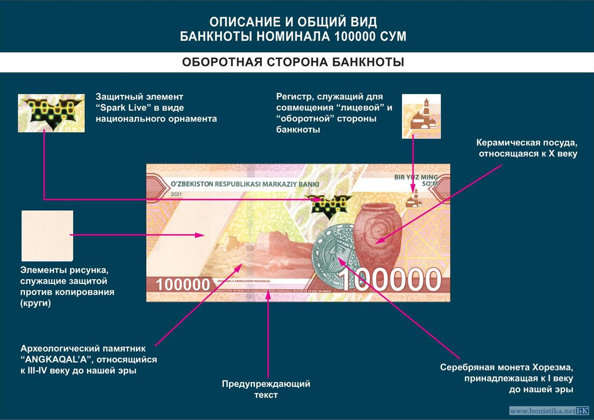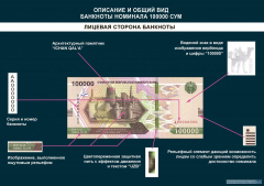 Банкнота 100 000 сумов имеет размер 152 х 69 мм. Преобладающий цвет лицевой и оборотной стороны – желтый в сочетании с другими цветами. С правой стороны банкноты, расположен локальный водяной знак в виде верблюда – символа древнего «Великого Шелкового пути» и номинал «100000». С правой стороны банкноты, в толще бумаги расположена металлизированная, машиночитаемая, цветопеременная защитная нить шириной 4 мм, желтого цвета с «эффектом движения» и текстом «UZB».