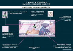Банкнота 50 000 сумов имеет размер 147 х 69 мм. Преобладающий цвет лицевой и оборотной стороны фиолетовый в сочетании с другими цветами. С правой стороны банкноты, расположен локальный водяной знак в виде верблюда – символа древнего «Великого Шелкового пути» и номинал «50000». С правой стороны банкноты в толще бумаги расположена металлизированная, машиночитаемая, цветопеременная защитная нить зеленого цвета, шириной 3 мм, с «эффектом движения».