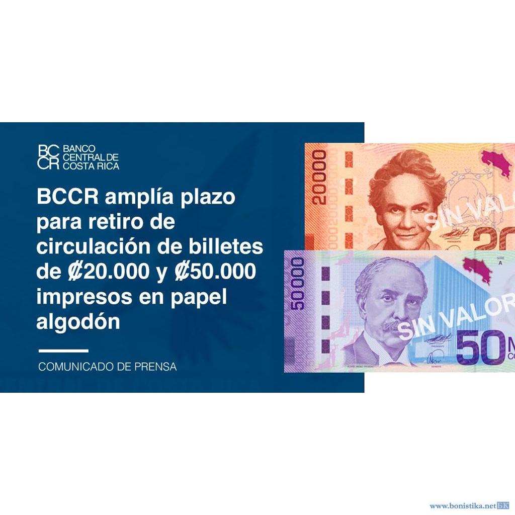 Центральный банк Коста-Рики (Banco Central de Costa Rica, BCCR) продлил срок обращения банкнот номиналом 20 000 и 50 000 колонов образца 2009 года (серия А). Информация об этом размещена на сайте банка www.bccr.fi.cr