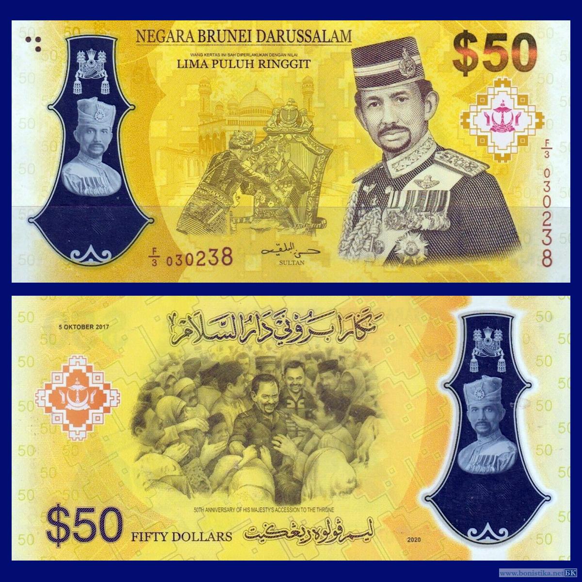 Напомним, что банкнота 50 ринггитов (брунейских долларов) была выпущена в 2017 году в честь 50-й годовщины вступления на трон султана Хассанала Болкиаха (Hassanal Bolkiah).