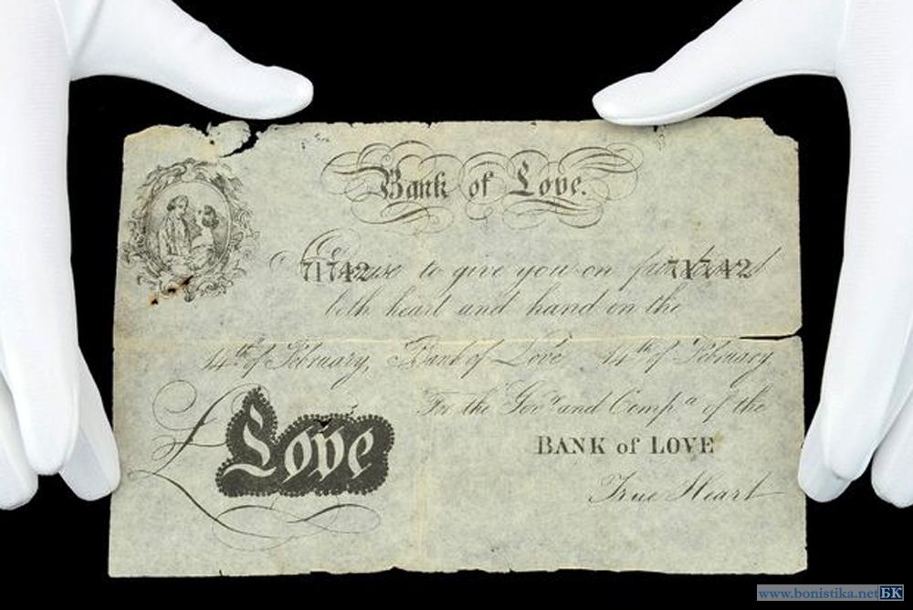 Лондонский аукционный дом Dix Noonan Webb выставил на торги две сувенирные "банкноты", выпущенные в Англии ко Дню Святого Валентина в середине XIX века. Они, как пишет издание www.manchestereveningnews.co.uk, являются частью большой коллекции сатирических, юмористических и пародийных "банковских билетов".