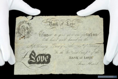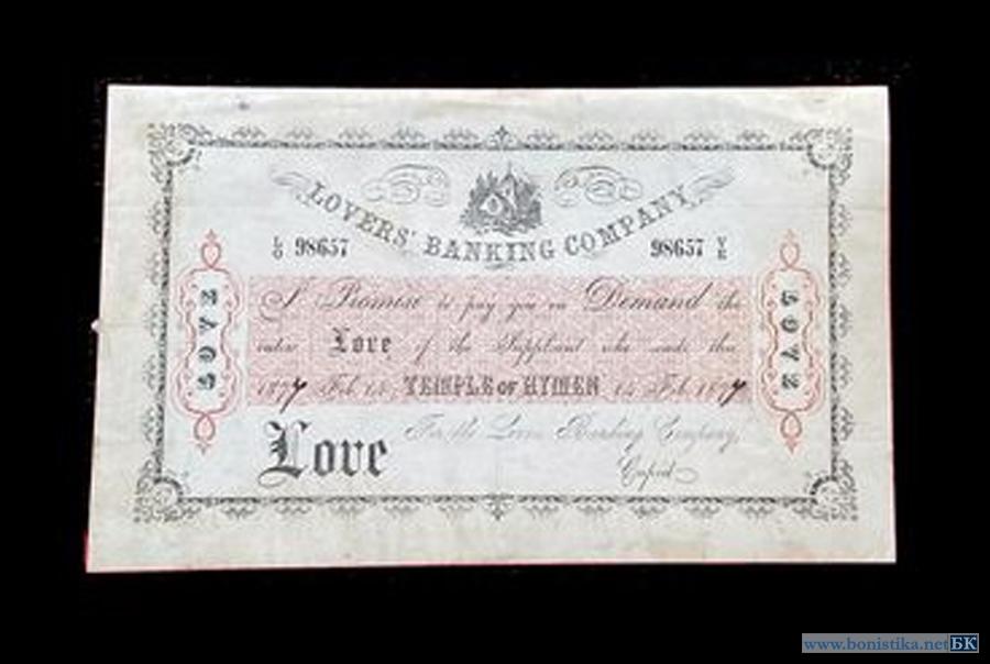 Первый знак (на фото вверху) пародирует билет Банка Англии номиналом 5 фунтов стерлингов. Он выпущен "Банком Любви" (Bank of Love) предположительно в 1840-1850 гг.. В тексте сообщается, что податель билета может получить и руку и сердце 14 февраля.