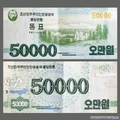 Центральный банк Корейской Народно-Демократической Республики (조선민주주의인민공화국중앙은행) эмитировал ваучеры "донпё" номиналом 50 000 вон. Один из экземпляров был зафиксирован в столице республики Пхеньяне.