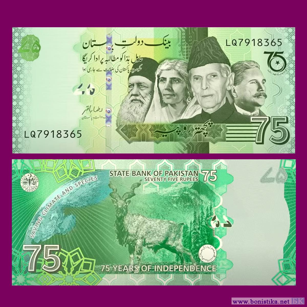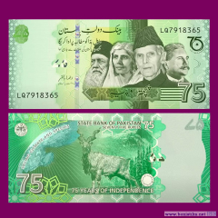 Государственный банк Пакистана (بینک دولت پاکستان, State Bank of Pakistan) показал общественности денежный знак, выпускаемый к 75-й годовщине образования Доминиона Пакистан, ставшего предтечей современной Исламской Республики Пакистан. Описание банкноты размещено на сайте ЦБ Пакистана www.sbp.org.pk