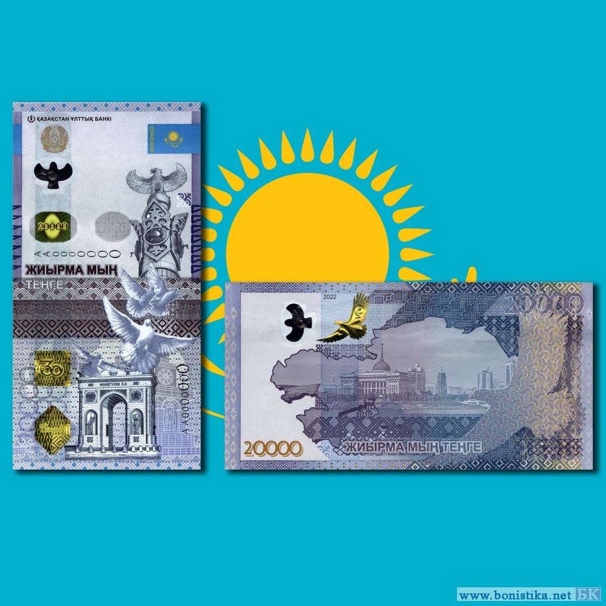 Национальный банк Республики Казахста́н (Қазақстан Республикасының Ұлттық Банкі) сообщмил, что с 1 октября 2022 года выпускает в обращение банкноту номинальной стоимостью 20 000 тенге. Описание банкноты опубликовано на сайте банка nationalbank.kz