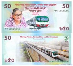 Банк Бангладеш ( বাংলাদেশ ব্যাংক, Bangladesh Bank) сообщил, что выпускает очередной памятный денежный знак номиналом 50 така 2022 года. Он посвящен юбилею пуска первой линии скоростного метро, сообщается в пресс-релизе на сайте банка www.bb.org.bd