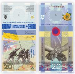 Памятная банкнота “ПОМНИМ! НЕ ПРОСТИМ!” номиналом 20 гривен вводится в обращение 23 февраля 2023 года. Она имеет яркий и выразительный дизайн, выполненный вертикально. Размер банкноты – 80 x 165 мм. Тираж составляет 300 тысяч штук, из которых: 200 000 шт. – в сувенирной упаковке; 99,9 тыс. шт. – в конвертах. Создал дизайн этой памятной банкноты заслуженный художник Украины Владимир Таран.