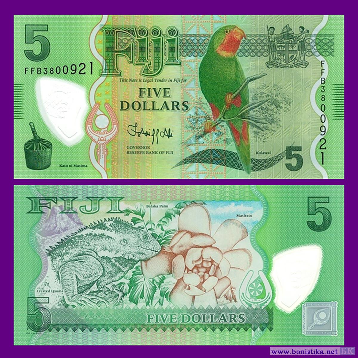 Резервный банк Фиджи (Reserve Bank of Fiji) выпустил в обращение новый тираж полимерных банкнот номиналом 5 фиджийских долларов серии 2012 года. Купюры подписаны действующим губернатором банка Ариффом Али (Ariff Ali).