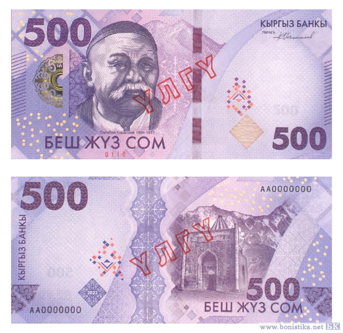 Национальный банк Киргизской Республики (Кыргыз Республикасынын Улуттук банкы) сообщил, что с с 10 мая 2023 года вводит в обращение банкноты номиналами 200, 500 и 1 000 сомов новой пятой серии национальной валюты. Сообщение об этом и описание купюр опубликованы на сайте банка www.nbkr.kg