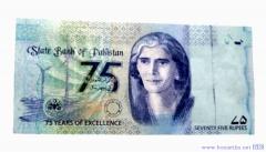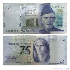 На торговой площадке www.ebay.com появились денежные знаки номиналом 75 пакистанских рупий 2023 года. Продавец сообщает, что это памятная банкнота в честь 75-й годовщины основания Государственного банка Пакистана (بینک دولت پاکستان, State Bank of Pakistan, SBP).