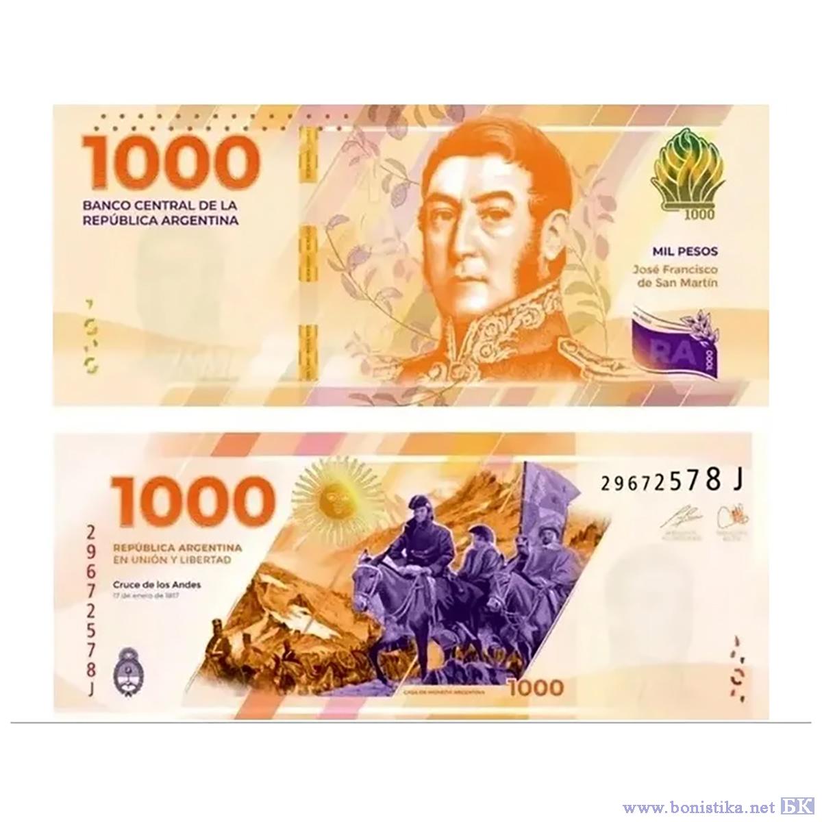 Напомним, что купюра 1 000 песо образца 2022 года была представлена общественности в мае 2022 года. На лицевой стороне изображен национальный герой Аргентины генерала Хосе Франсиско де Сан-Мартин и Маторрас (José Francisco de San Martín y Matorras; 1778-1850 гг.). Решение использовать его портрет принято после того, как администрация BCRA объявила, что банкноты 5 песо с портретом генерала выводятся из обращения.