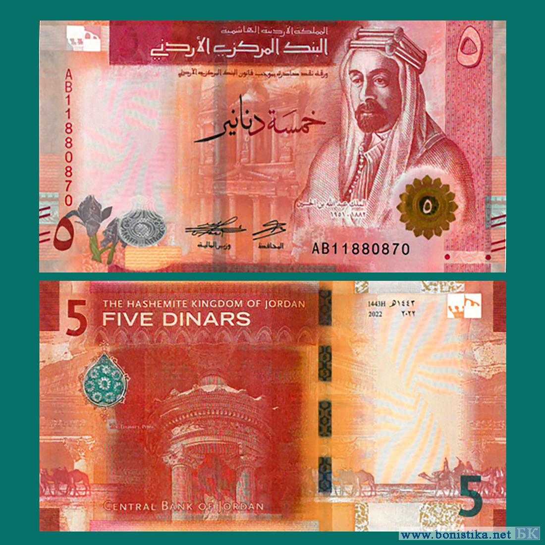Центральный банк Иордании (Central Bank of Jordan, البنك المركزي الأردني) с 16 августа 2023 года начал эмиссию банкнот номиналом 5 иорданских динаров нового поколения. Сообщение об этом опубликовано на официальном сайте банка www.cbj.gov.jo