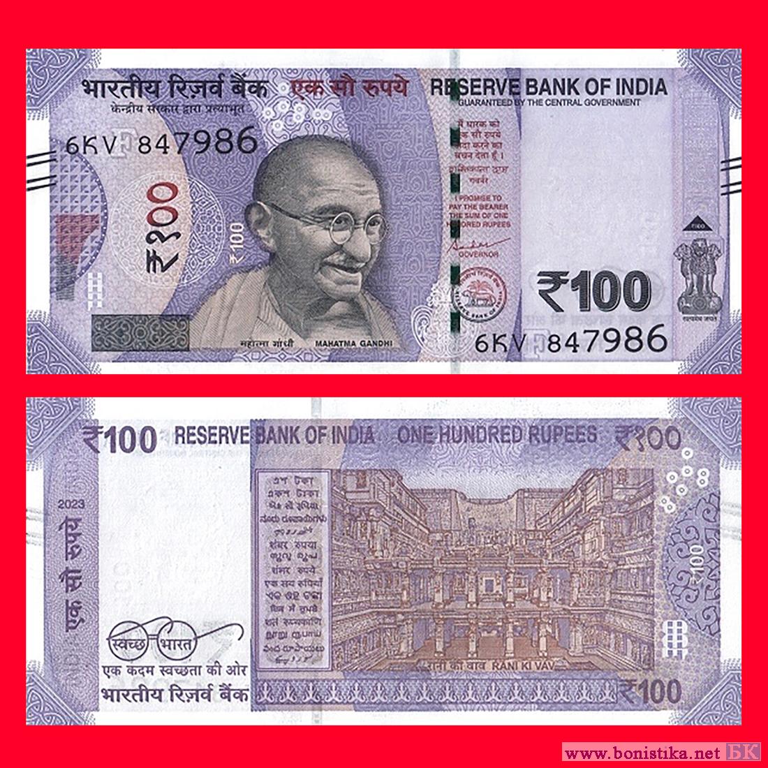 Резервный Банк Индии (Reserve Bank of India) выпустил в обращение тираж банкнот номиналом 100 индийских рупий образца 2018 года с датой "2023".