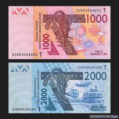 Выпуск, маркированный буквой Т, датирован 2023 годом. Дата эмиссии зашифрована в двух первых цифрах номера на лицевой стороне купюр. Тиражи подписал новый глава BCEAO Жан-Клод Касси Бру (Jean-Claude Kassi Brou). Он возглавил банк в 2022 году.