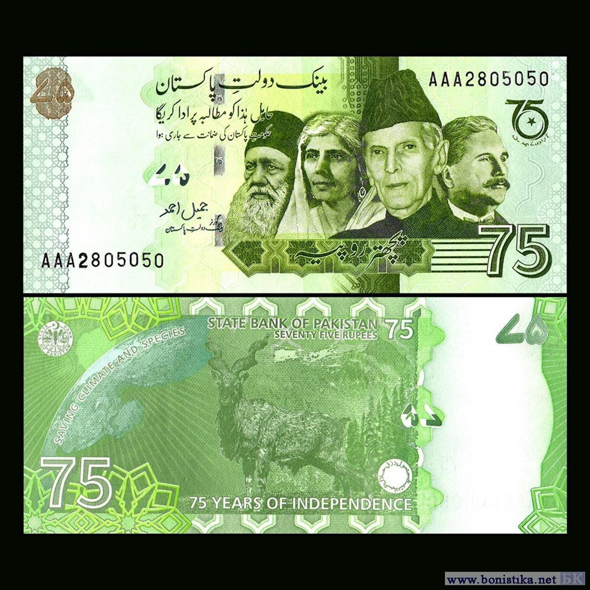 Выявлены две разновидности серийного номера у памятных банкнот номиналом 75 рупий, выпущенных в 2022 году к 75-й годовщине провозглашения независимости Пакистана.