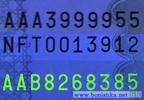 Номера серий NFT и ААА в таком освещении сохраняют черный цвет чернил. А номера серий от ААВ до AAL под ультрафиолетовым освещением меняют цвет на зеленый.