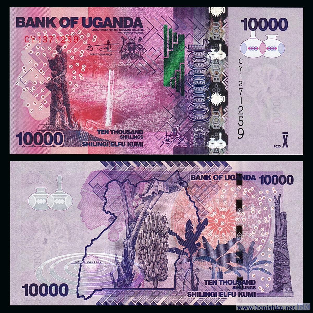 Банк Уганды (Bank of Uganda) выпустил в обращение новый тираж денежных знаков номиналом 10 000 угандийских шиллингов образца 2010 года. Выпуск датирован 2023 годом.