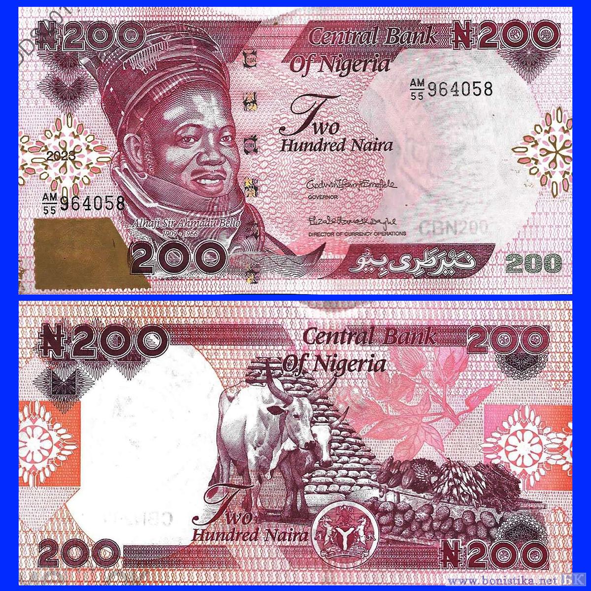 Центральный банк Нигерии (Central Bank of Nigeria) снова обновил обиходную купюру номиналом 200 наира образца 2022 года. На лицевой стороне купюр нового тиража изменено факсимиле подписи директора Департамента валютных операций банка.