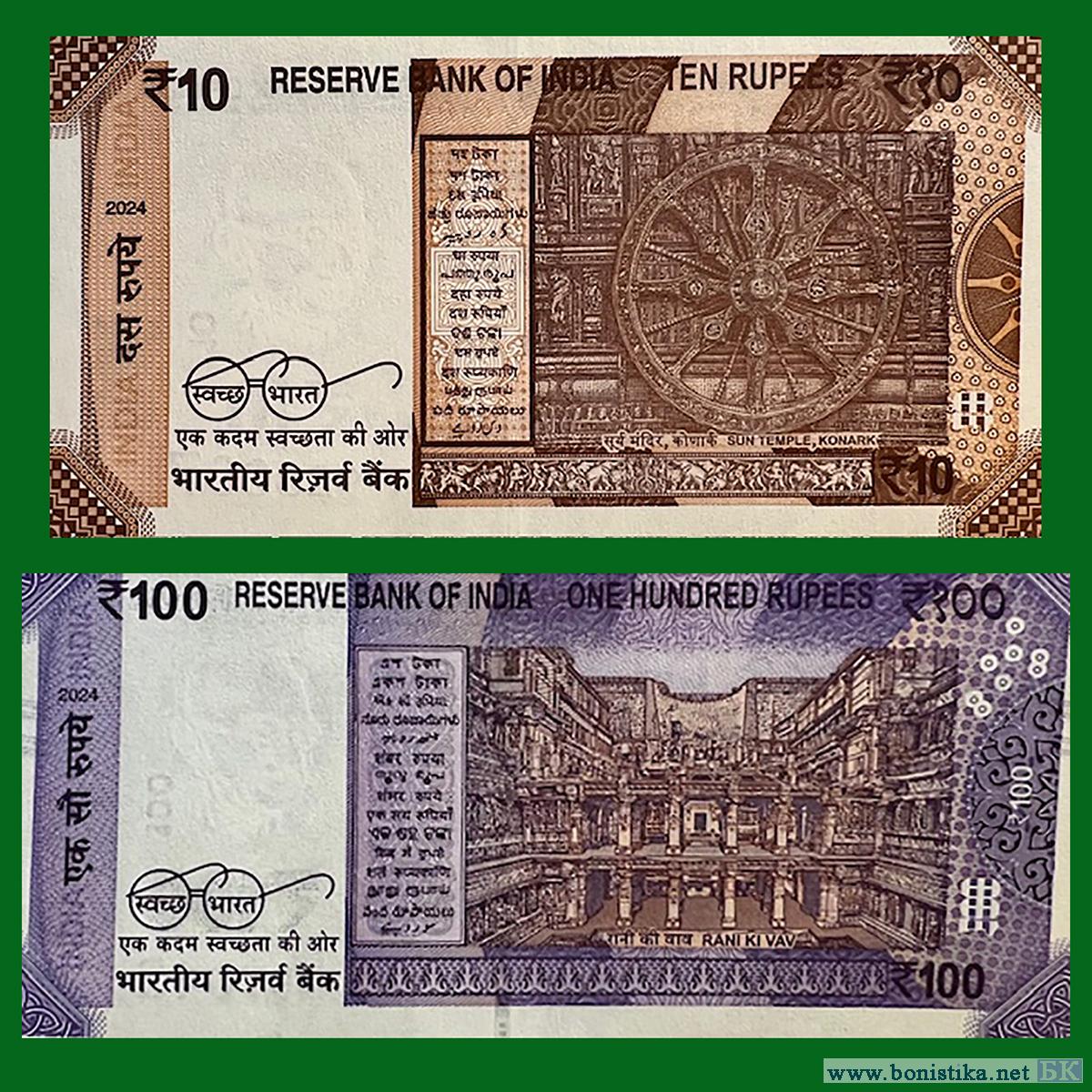 Резервный банк Индии (Reserve Bank of India; भारतीय रिज़र्व बैंक) выпустил в обращение тиражи банкнот номиналом 10 и 100 индийских рупий образца 2016 года. Выпуски датированы 2024 годом, дата эмиссии отпечатана на оборотной стороне банкнот.