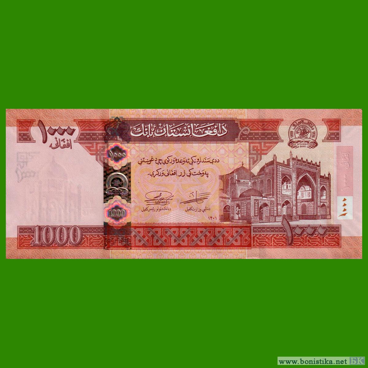 Да Афганистан банк (د افغانستان بانک; بانک مرکزی افغانستان) выпустил в обращение новый тираж банкнот номиналом 1 000 афгани образца 2008 года (1387 года Хиджры).