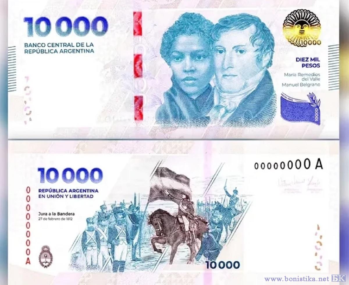 Центральный банк Аргентинской Республики (Banco Central de la República Argentina, BCRA) официально объявил о выпуске в обращение бумажного денежного знака номиналом 10 000 аргентинских песо. Сообщение об этом и описание новой банкноты опубликованы на сайте банка www.bcra.gob.ar/