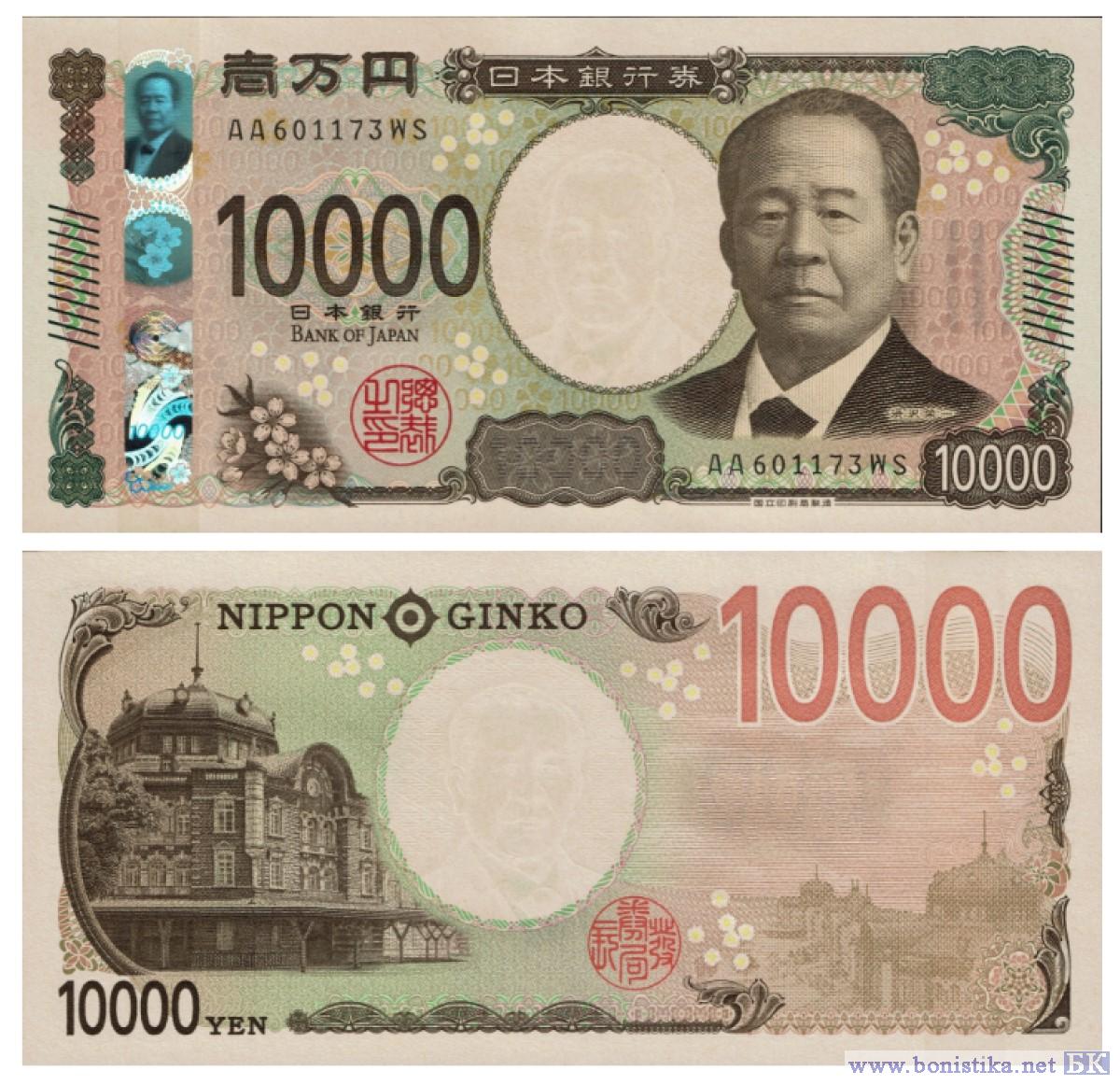 На купюре 10 000 иен изображен Сибусава Эйити, 1-й виконт Сибусава (渋沢 栄一, 1840-1931 гг.), он был японским промышленником, широко известным сегодня как «отец японского капитализма», внедрившим западный капитализм в Японию после Реставрации Мэйдзи. На оборотнойстороне изображен вид на Токийский железнодорожный вокзал в районе Маруноути. Размер купюры 160 x 76 мм.