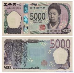 На купюре 5 000 иен изображена Цуда Умэко (津田 梅子, 1864-1929 гг.), она была японским педагогом, основателем Университета Цуда. На оборотной стороне купюры изображены цветы глицнии (Wistеria). Размер купюры 156 x 76 мм.