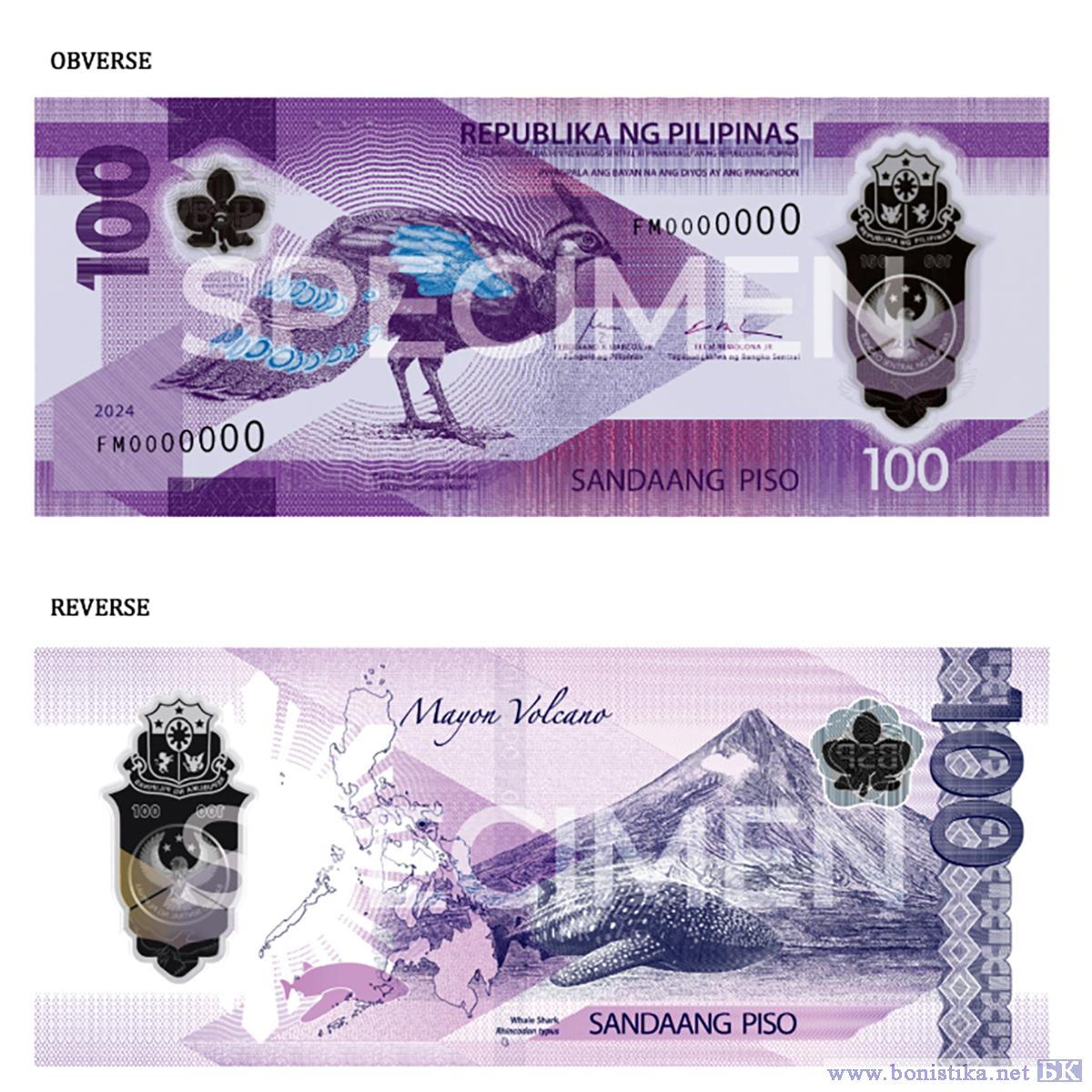 - 100 писо: Вулкан Майон, китовая акула и узор в виде плетения региона Бикол;