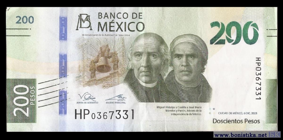Банк Мексики (Banco de México) выпустил в обращение новый тираж банкнот 200 песо образца 2018 года с датой 6 декабря 2023 года (6 DIC. 2023) и подписями члена совета директоров банка Виктории Родригес (Victoria Rodríguez Ceja) и главного кассира Алехандро Рабиела (Alejandro Alegre Rabiela).