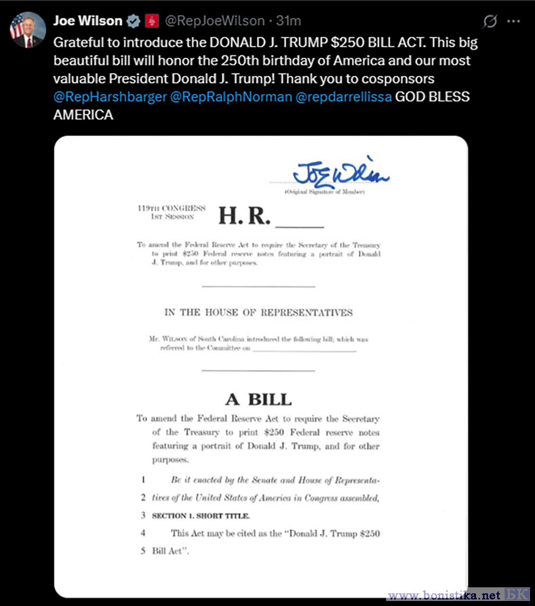 Но куда национал-индусам до трэш-угар-трампистов из США. Сегодня конгрессмен из Южной Каролины, республиканец Джо Уилсон (Joe Wilson) вместе группой других конгрессменов зарегистрировал в Конгрессе проект федерального закона о выпуске в обращение памятной банкноты с портретом... Дональда Трампа (правда, неожиданно?).