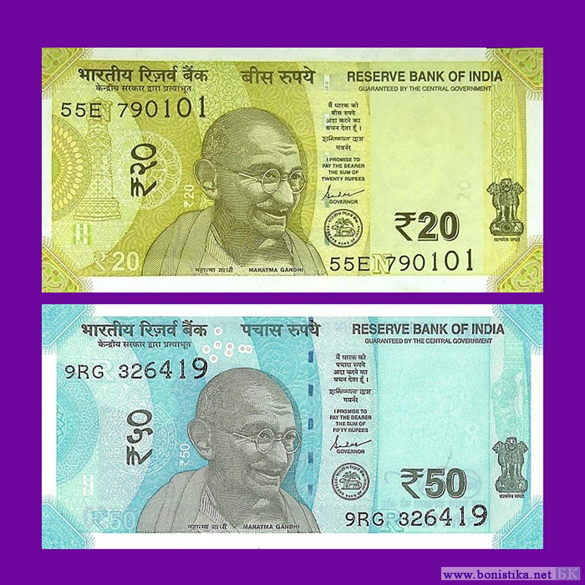 Резервный банк Индии (Reserve Bank of India; भारतीय रिज़र्व बैंक) выпустил в обращение новые тиражи банкнот номиналом 20 и 50 индийских рупий образца 2019 и 2017 годов соотвественно.