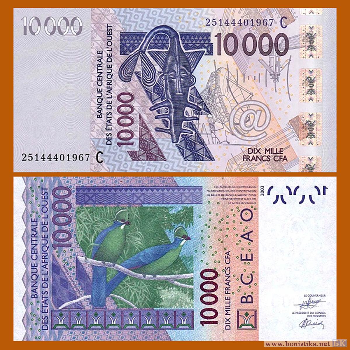 Центральный банк государств Западной Африки (Banque Centrale des États de l’Afrique de l’Ouest, BCEAO) продолжает эмиссию франков КФА. В обращении появились банкноты номиналом 10 000 франков КФА серии 2003 года для Буркина Фасо (Burkina Faso), датированные 2025 годом.