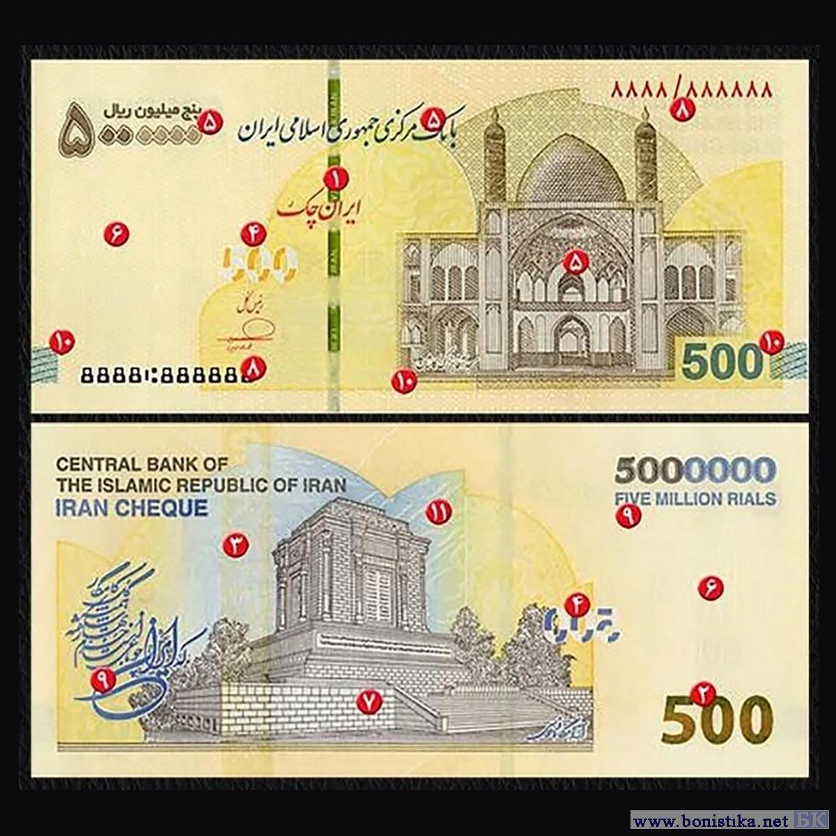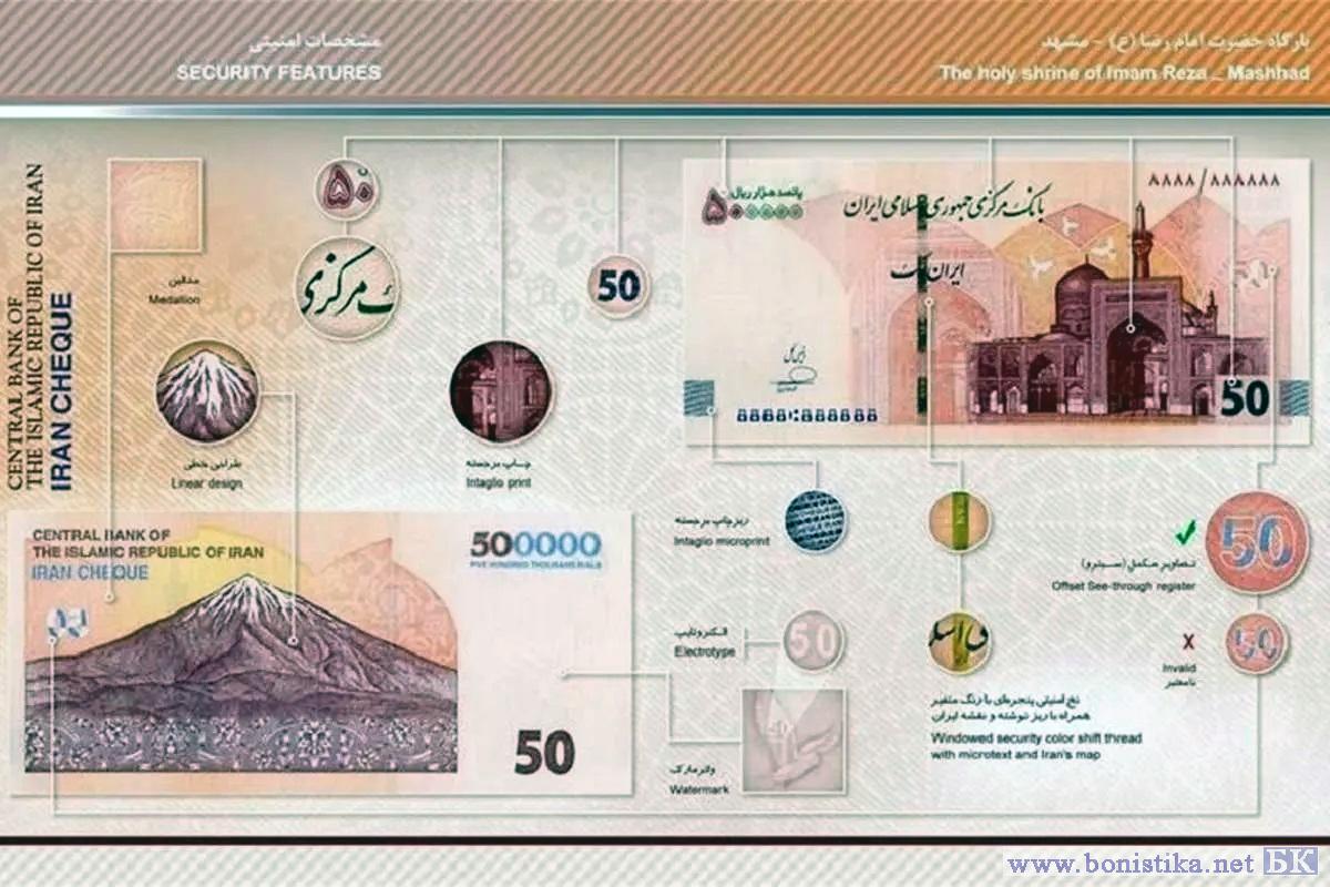 Центральный банк Исламской Республики Иран (بانک مرکزی جمهوری اسلامی ایران) выпустил в обращение модернизированные иранские чеки номиналом 500 000 риалов. Описание новых денежных знаков опубликованы в иранских СМИ.