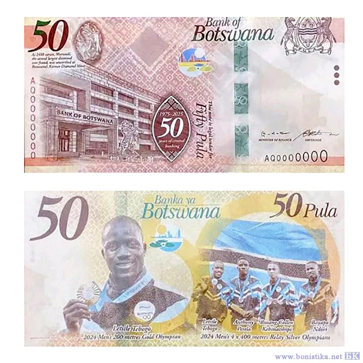 В честь своего 50-летия Банк Ботсваны (Bank of Botswana; Banka ya Botswana) представил памятную банкноту номиналом 50 пула, посвященную юбилею ведомства и спортивным достижениям ботсванийских легкоатлетов.