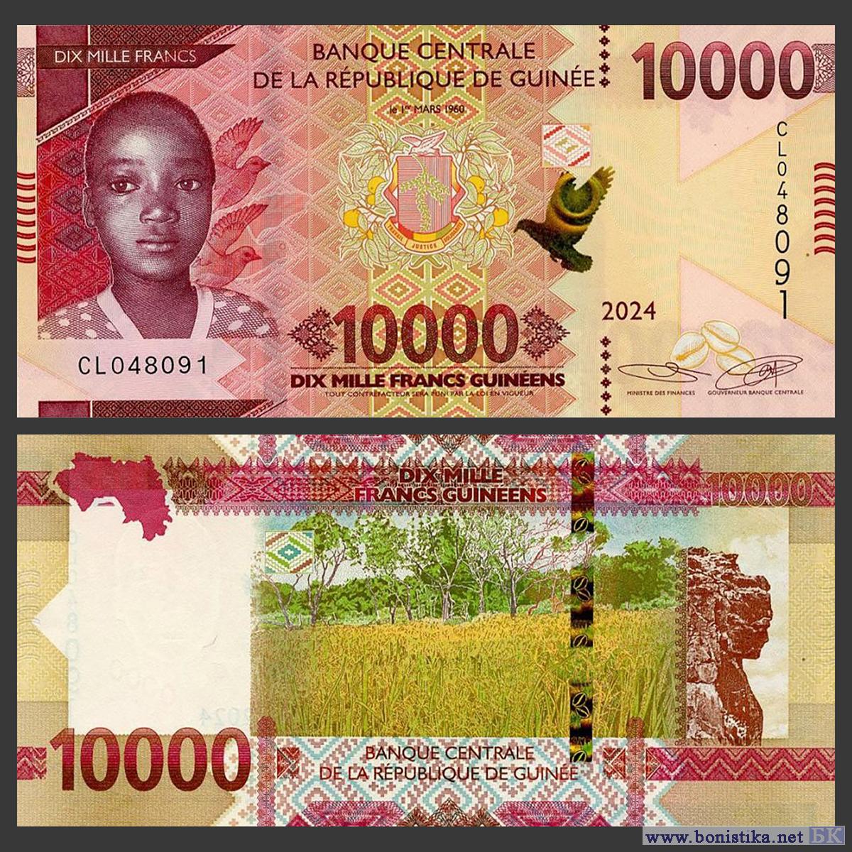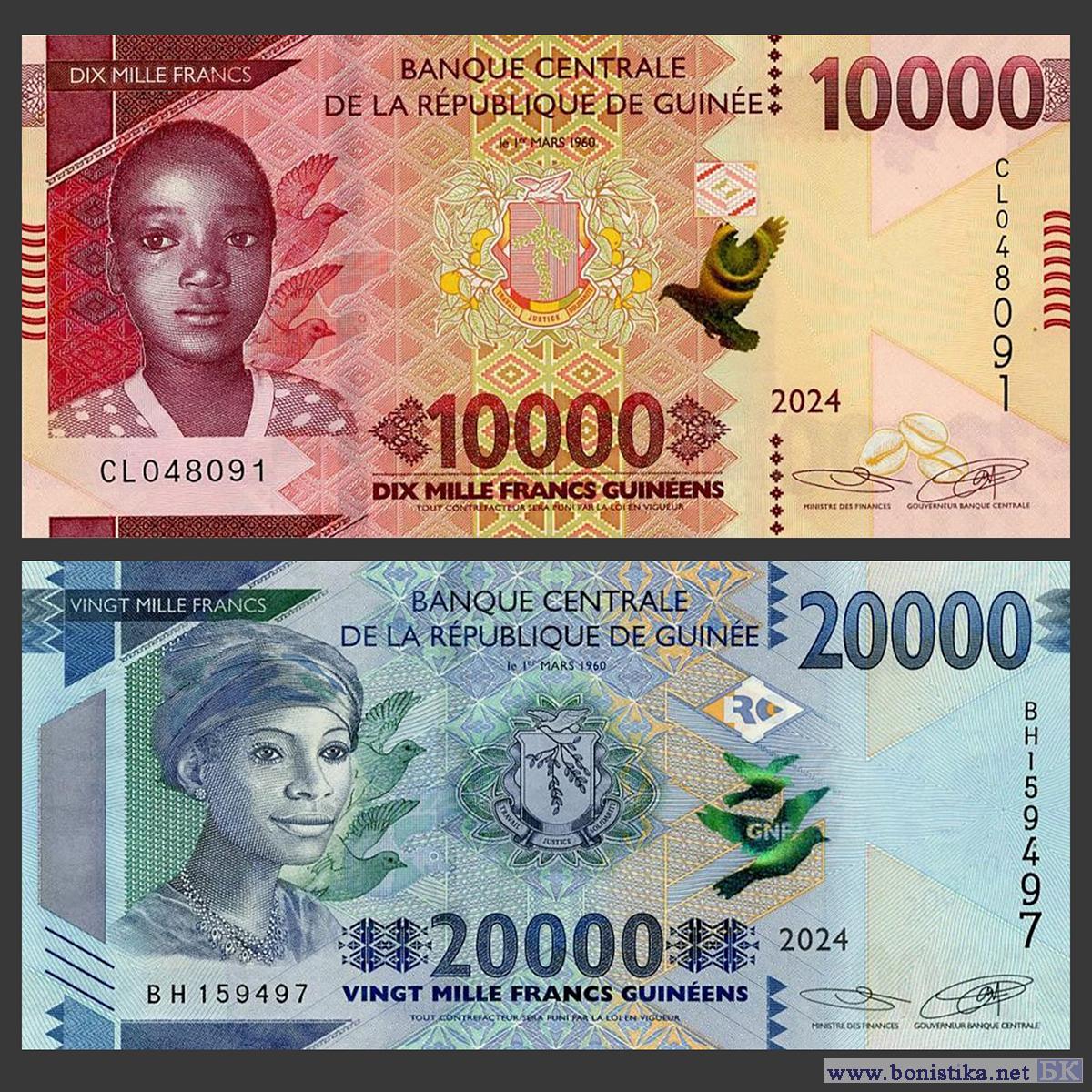 В обращение поступили банкноты номиналом 10 000 и 20 000 гвинейских франков, датированные 2024 годом. Две недели назад, 31 августа, Центральный банк Гвинейской Республики (Banque Centrale de la République de Guinée, BCRG) заявил, что получил новую партию банкнот, предназначенных для снабжения касс и банкоматов коммерческих банков.