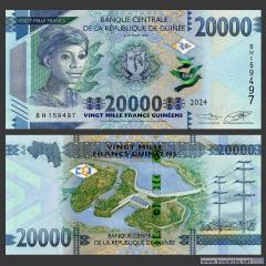 На лицевой стороне банкнот 20 000 франков 2024 года обновлен цветопеременный элемент в форме голубя. Также заменена защитная полоса на оборотной стороне. Изменен рисунок: вместо ломаных линий помещены концентрические круги с голографическим эффектом. В них читается текст "GNF 20000".