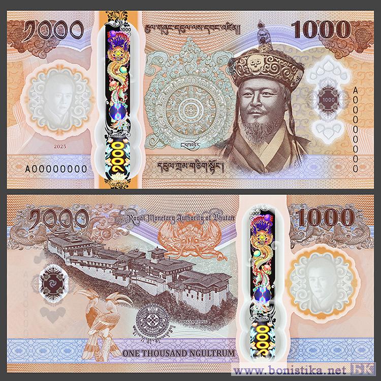 - 1 000 нгрултум 2025 года, тема банкноты "Дань уважения основателю династии королей Бутана".