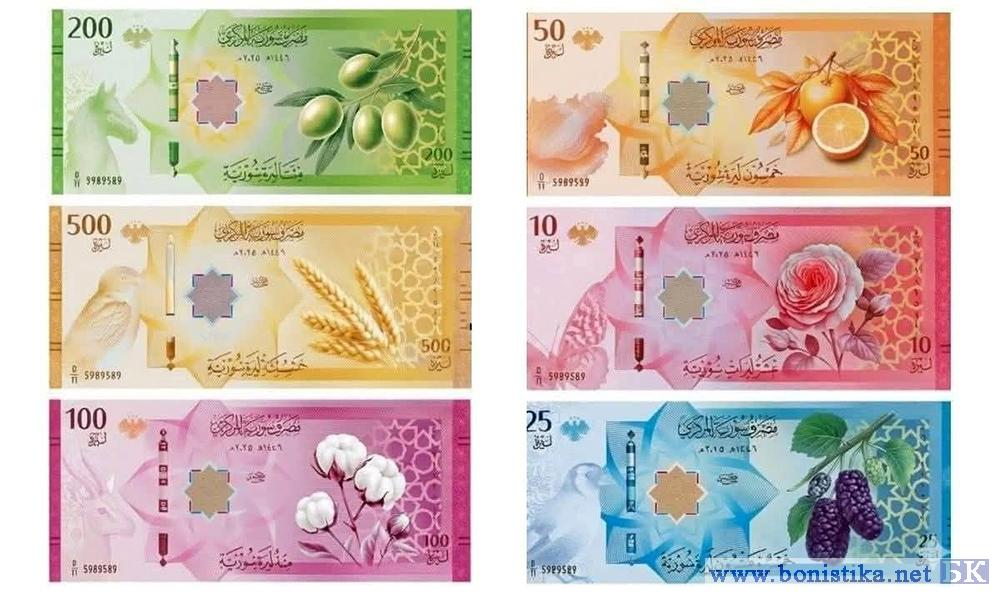 В новой серии шесть купюр номиналом 10, 25, 50, 100, 200 и 500 сирийских фунтов. Как и было обещано, на банкнотах нет изображения людей. Вместо этого изображены природные ресурсы Сирии, включая дамасскую розу, дамасскую шелковицу, апельсины, пшеницу, хлопок и оливки, а также элементы окружающей среды и дикой природы, такие как арабская лошадь, газель, воробей, бабочка и ракушки.